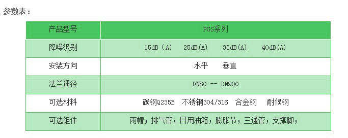 產(chǎn)品選型:PGS系列以進排氣口直徑標示尺寸,最小為80MM,每個尺寸等級為25MM的整數(shù)倍。例如,需要住宅級消聲器,法蘭接口尺寸為DN200,消聲器型號為:PGS25-200。