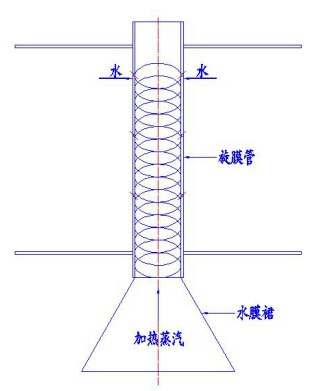 旋膜除氧器與噴霧填料式、淋水盤式等其它類型的熱力除氧器在性能上存在著根本性不同,其關(guān)鍵之處在于增壓旋膜器結(jié)構(gòu)汽水傳熱傳質(zhì)方式,凝結(jié)水及補(bǔ)充水進(jìn)入除氧頭內(nèi),增壓旋膜器、溢流裝置組合成水室,在0.2MPa的壓力下水從增壓旋膜器的螺旋小孔斜旋噴向內(nèi)壁,形成水膜裙與自下向上的一次加熱蒸汽在管內(nèi)熱交換,水在射流運(yùn)動(dòng)中和加熱蒸汽吸卷進(jìn)行(經(jīng)試驗(yàn)證明射流運(yùn)動(dòng)具有卷吸作用)除氧。短時(shí)間內(nèi)在小行程情況產(chǎn)生劇烈的汽水混合加熱,水溫大幅度上升,射旋的水膜裙沿著旋膜管內(nèi)壁自上向下射旋,形成紙一樣薄的水膜裙(如圖所示),水膜裙與加熱蒸汽熱交換時(shí)間充分,此時(shí)傳熱傳質(zhì)效果最理想,水溫達(dá)到飽和溫度,氧被分離及時(shí),由于旋轉(zhuǎn)水流緊貼內(nèi)管壁旋轉(zhuǎn)向下,在旋膜管中間形成汽水通道,不存在氣體流動(dòng)死區(qū),因氧氣在管內(nèi)無法隨意擴(kuò)散,逸出的氧氣被從旋膜中間向流動(dòng),隨著上升的蒸汽從排氧管口排向大氣。
