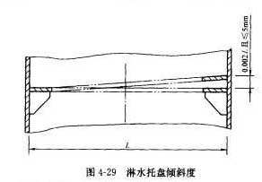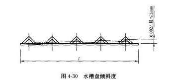 淋水盤(包括各種配水淋水盤)及其托盤的裝配安裝至關(guān)重要,其傾斜將造成水流斜向一側(cè)而使出水細流不均以致影響傳熱和除氧性能。淋水托盤支撐架徑向傾斜度偏差在土2mm/m,且總偏差在土5mm之內(nèi),見圖4-29。