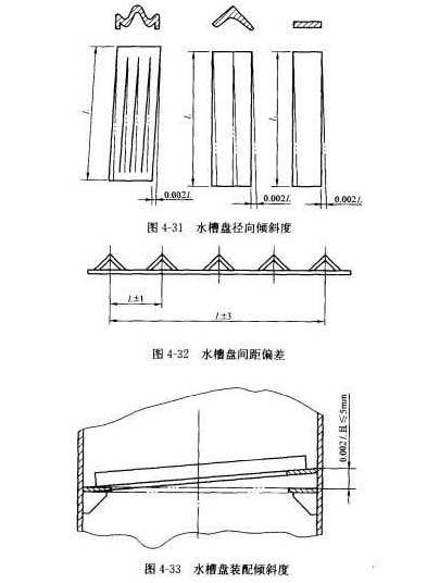 規(guī)則填料(水槽盤)設(shè)計結(jié)構(gòu)形式多種多樣,有W型、角鋼型、扁鋼型、半圓型等,如裝配成上下傾斜,會造成水流不均,下端水流名而上端水流少,以致影響性能。水槽盤水平線裝配縱向及徑向傾斜度偏差在土2mm/m以內(nèi),且總偏差在土5mm之內(nèi),見圖4-30.水槽盤裝配的傾斜度在土2mm/m之內(nèi),見圖4-31。兩水槽盤中心間的距離偏差在士1mm之內(nèi),任意兩水槽盤中心間的距離偏差在土3mm之內(nèi),見圖4-32。水槽盤裝配的傾斜度在土2mm/m之內(nèi),且小于等于5mm,見圖4-33。